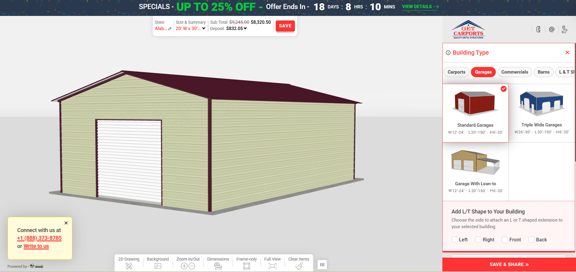Use our 3D builder to customize dimensions, colors, doors, and windows — then get an instant quote.